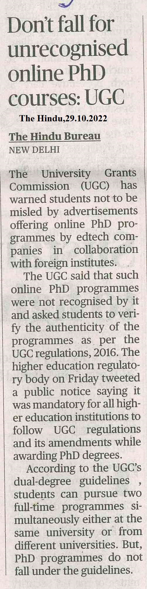 Streamlining of Higher Education, Online Ph.D not eligible