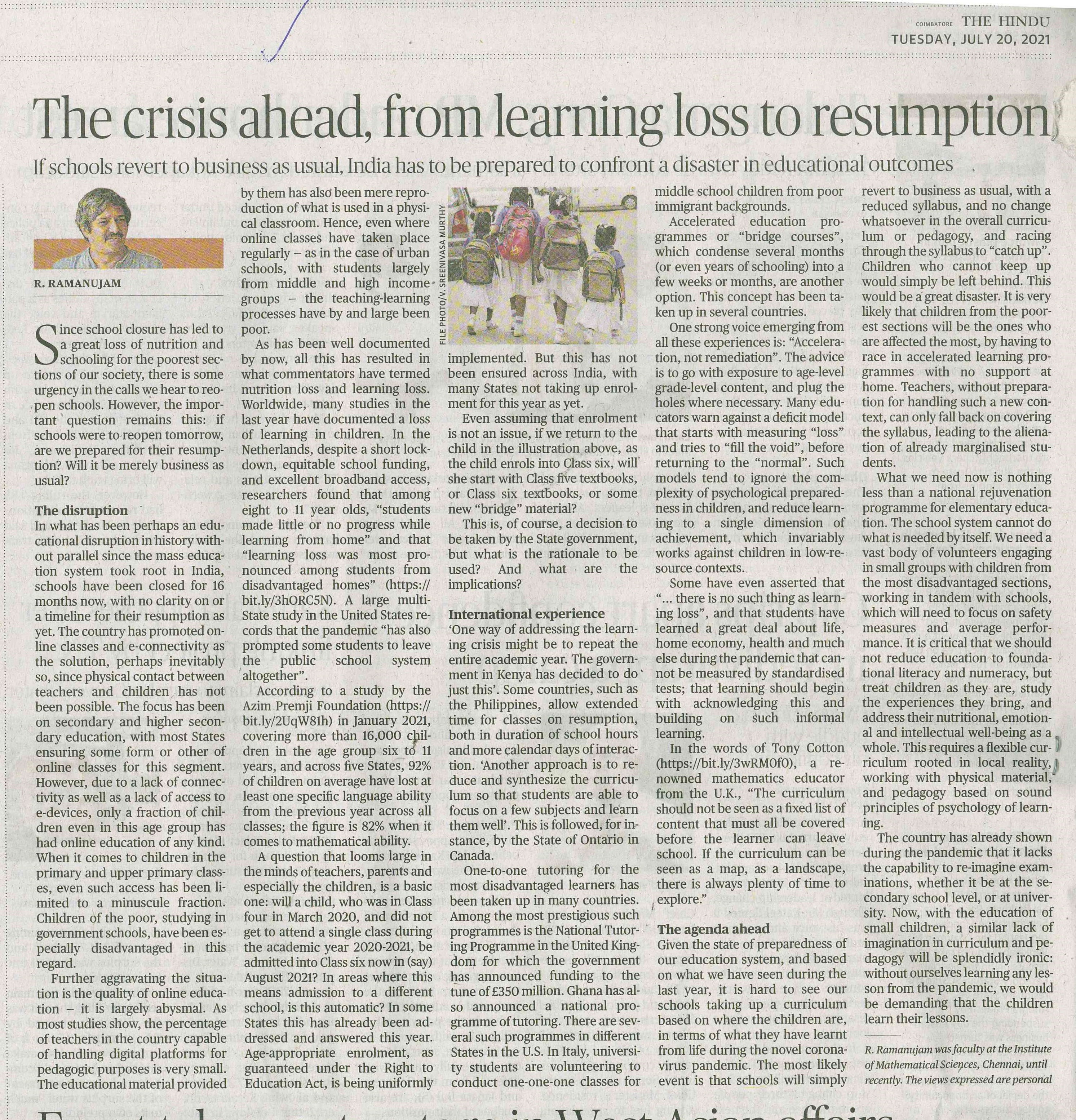 The Crisis ahead, from learning loss to resumption